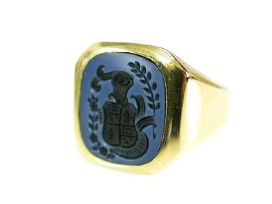 One custom-made 14 karat yellow gold ring. One carved agate depicting a coat of arms and olive branch on the right side and floral branch on the left.