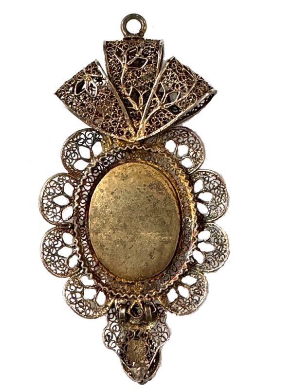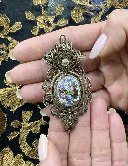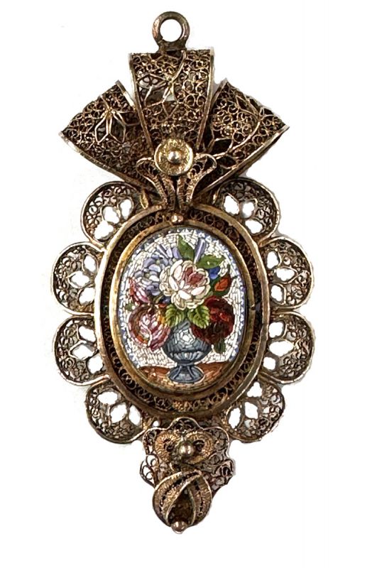 A beautiful oval micro mosaic pendant of flowers in a vase surrounded by elegant silver gilt filigree. The pendant is approx. 2 7/8 inches (7.30cm) long X 1.5 (1 1/2) inches (3.81cm) widest and weighs 17.7 grams.