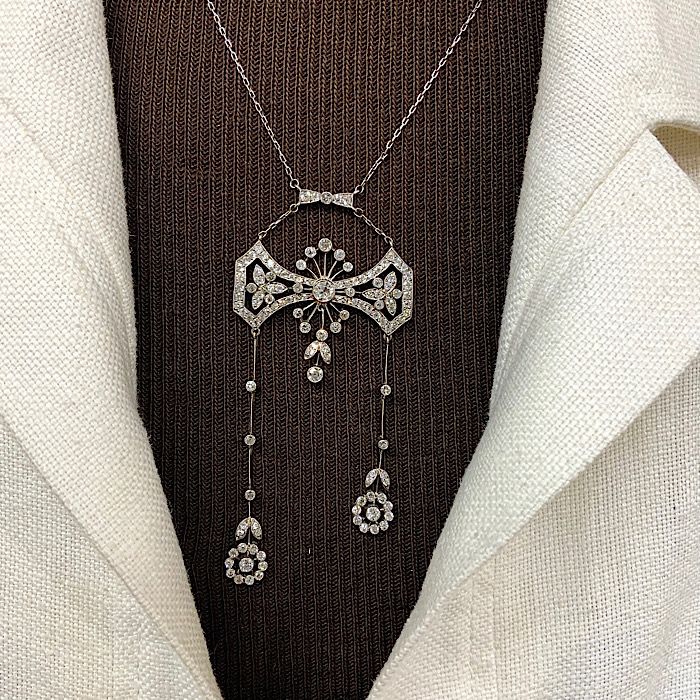 A beautiful Edwardian 18kt white gold openwork necklace with 1 old European cut diamond, est. 0.26ct (SI2 clarity: G-H colour); 46 old European cut diamonds, est. 1.92ct (VS-SI1 clarity: G-H colour) and 70 old European cut diamonds, est. 1.44ct (VS-SI  clarity: G-H colour). It is approx. 16.5 inches (41.91cm) in length.