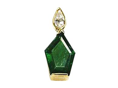 A beautiful vintage 14kt yellow gold pendant and features 1 step bullet cut deep green tourmaline, est. 2.75ct and 1 pear brilliant cut diamond, est. 0.22ct (VS2 clarity: G colour). It is approx. 7/8 inch (2.22cm) long X 3/8 inch (0.95cm) widest. The chains shown in the photos are sold separately.