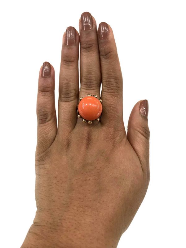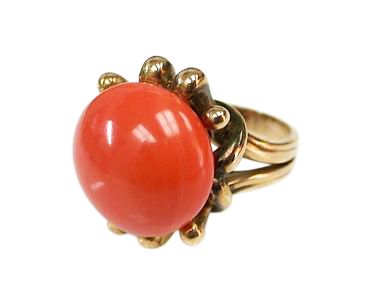 One 14 karat yellow gold ring. One cabochon coral.