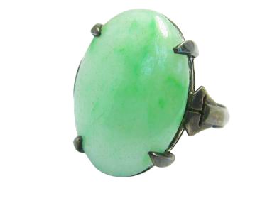 One vintage sterling silver ring with buckle motif shoulders with a four-claw setting. One oval jadeite jade (11.00 carats: natural light greyish green colour mottled with brighter tones).