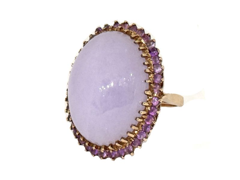 A stunning vintage 10 kt. yellow gold ring, featuring 1 oval cabochon, highly translucent, lavander jade. approx.50.50 ct. (30.09 x 18.8 x 10.28mm) and surrounded by 38 medium intense violet coloured amethysts, est. 1.11ct. that are moderately included. It is currently size 5.25 (5 1/4) and can be sized. The ring is approx 1.25 (1 1/4) inches (3.18cm) long X 7/8 inch (2.22cm) wide and weighs 5.58 grams.