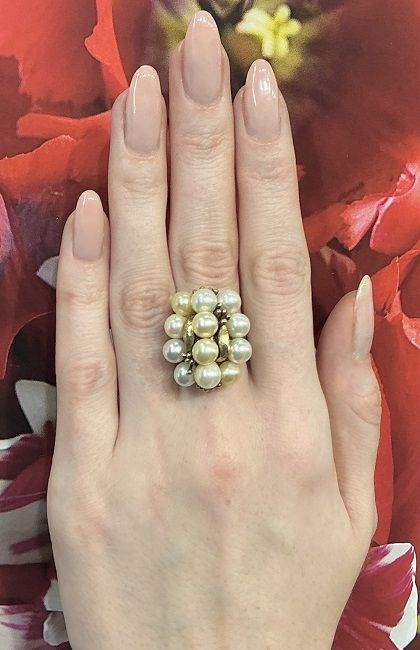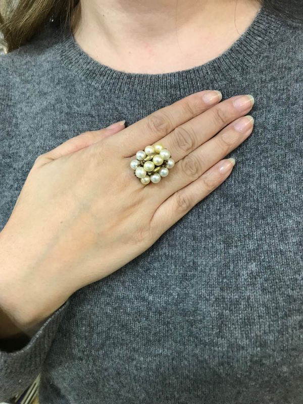 One 14 karat yellow gold pearl cluster ring. Twelve cultured pearls (6.36-6.48 mm) of rose colour with yellow overtones.