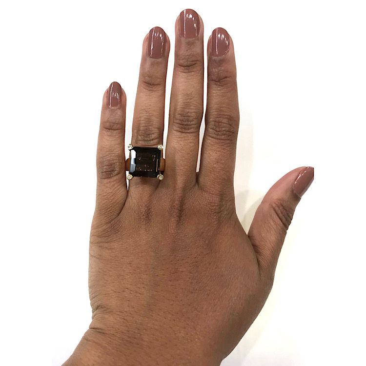 A stunning modern 18kt yellow gold ring featuring 1 dark brown smoky quartz, est. 8.89ct and 4 round brilliant cut diamonds, est. 0.04ct (SI clarity: H-I colour). It is currently size 7.25 (7 1/4) and can be sized.