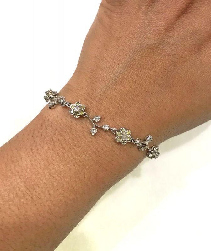 A beautiful 14kt white gold floral motif bracelet with 5 round brilliant cut diamonds, est. 0.25ct (clarity:I1-I2 & K-L colour); 29 round brilliant cut diamonds, est. 0.29ct (clarity:I1-I2 & J-K-L colour) and 30 round brilliant cut light fancy yellow diamonds, est. 0.31ct (clarity:I1-I2). It is approx. 7 inches (18.48cm) in length and has a safety clasp.