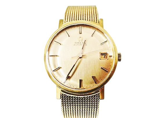 A beautiful 18kt yellow gold Omega automatic date wristwatch. It has a round satin dial with baton numerals, gold hands and the date at 3 o'clock.