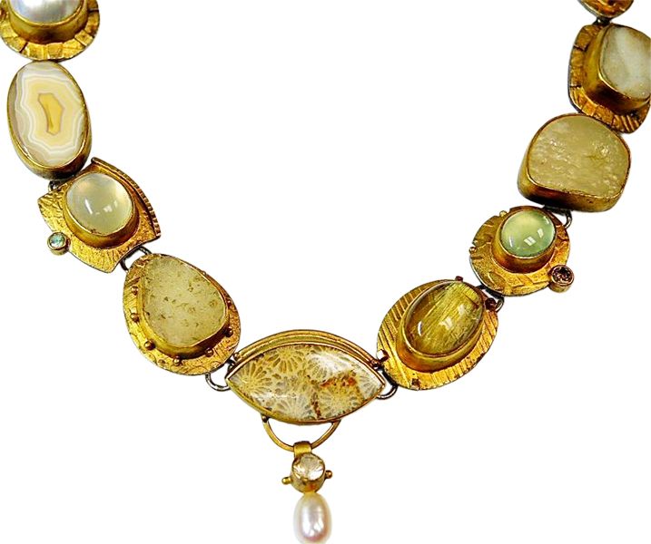 One 14 karat yellow gold and silver necklace set with cabochon quartz, three freeform quartzite, four cabochon agate and four mabe and freshwater pearls. The necklace is futher set with three round brilliant cut diamonds (0.40 carats: SI clarity: light brown colour). Two aquamarines (0.25 carats). Two round facetted paste. 19.25'' in length.
