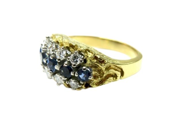 A beautiful vintage 18kt. yellow and white gold ring, with 5  round faceted cut medium blue sapphires, est. 0.78ct. and 8 round brilliant cut diamonds, est. 0.44ct. (clarity:VS-SI1 & colour G-H). It is currently size 6.5 (6 1/2).
