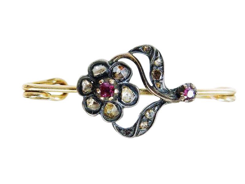 A beautiful Victorian 9kt yellow gold and silver top floral brooch with 2 cushion cut medium-deep red rubies, est. 0.10ct and 13 rose cut diamonds, est. 0.18ct (clarity:SI-I1 & K-L-M colour).