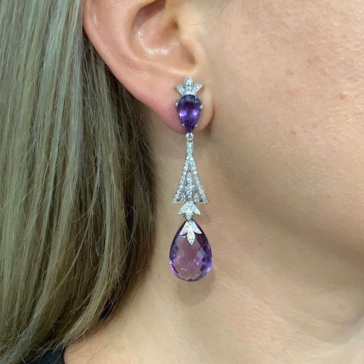 A stunning pair of vintage platinum drop earrings. circa 1950's, featuring 2 checkerboard top briolette medium intense amethysts, est. 29.90ct; 2 pear faceted cut medium intense amethysts, est. 6.26ct and 94 round brilliant cut diamonds,est. 1.03ct (clarity:SI-I1 & H-I-J colour).