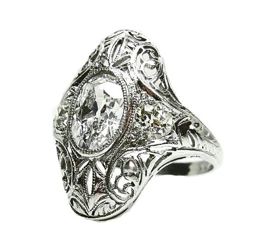 An beautiful vintage platinum mill grain, engraved and filigree ring featuring 1 oval brilliant cut diamond, est. 1.02ct (clarity: SI1 & colour: E) and 2 old mine cut diamonds, est. 0.40ct. (clarity: SI2-I1 & colour: H-I)