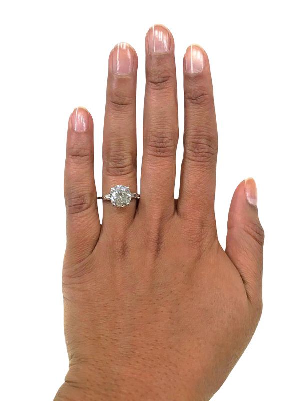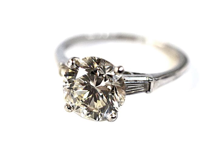 A stunning vintage platinum ring featuring 1 round brilliant cut diamond, est. 3.03ct (SI1 clarity & I-J colour) and 2 baguette diamonds, est. 0.41ct (VS clarity & G-H colour). It is currently size 7 and easily sized.