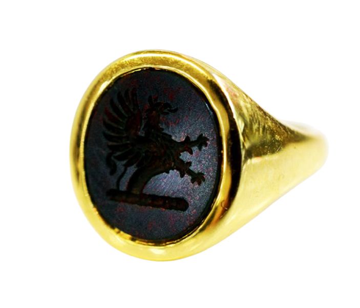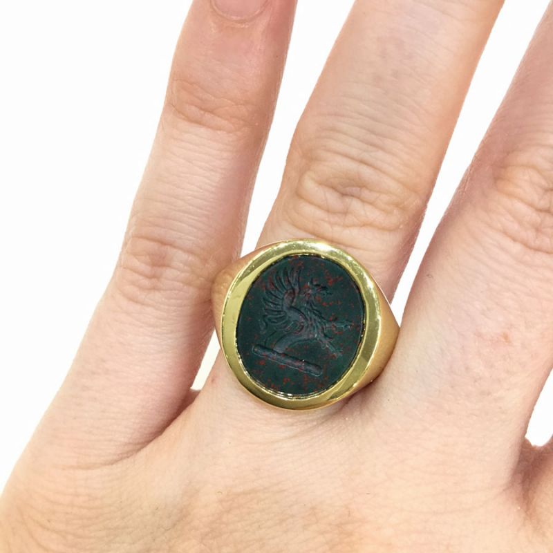 Featuring a masterfully carved intaglio in an oval rich forest green with bright red flecks bloodstone showing the side profile of a griffin rampant.
