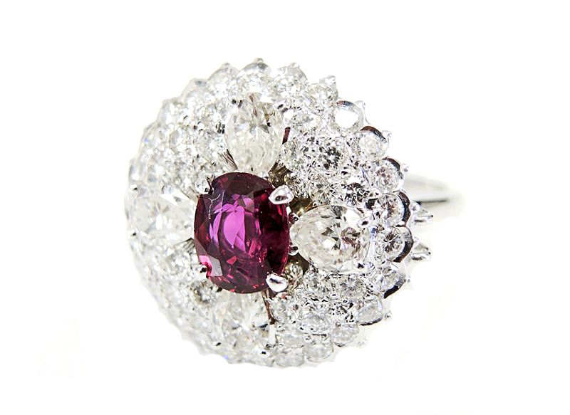 A stunning vintage 14-18kt white gold ring featuring 1 oval faceted cut deep red ruby, est. 0.97ct; 4 pear brilliant cut diamonds, est. 1.10ct (clarity:VVS-VS & E-F colour); and 50 round brilliant cut diamonds, est. 1.50ct (clarity:VVS & G-H colour). It is currently size 6, very very slightly loose and easily sized.