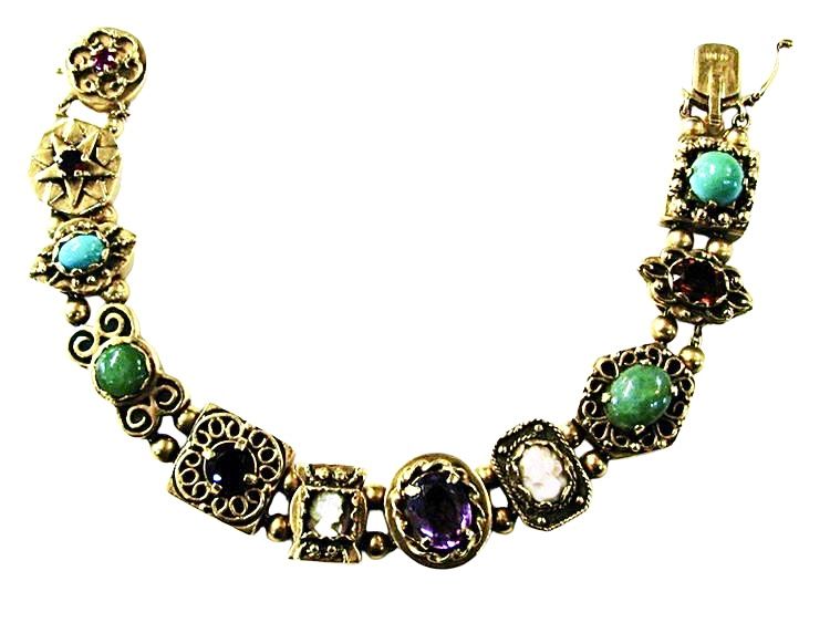 A beautiful vintage 14kt yellow gold slide bracelet, that is set with 1 round cut deep red ruby, est. 0.15ct; 2 round facetted cut dark red garnets, est. 1.27ct; 1 round cabochon medium green turquoise, est. 0.88ct; 1 round cabochon medium green chrysophrase, est. 2.36ct; 1 oval cabochon medium green chrysophrase, est. 2.20ct 1 round cabochon medium green turquoise, est. 1.82ct; 1 oval facetted medium purple amethyst, est. 2.00ct; 1 oval facetted medium brownish red garnet, est. 0.90ct; 1 mother-of-pearl cameo, approx 6.5 x 6.0mm and 1 pale pink coral cameo, approx. 8.0 x 6.0mm. It is approx. 7 inches (18.48cm) in length and has a safety clasp.