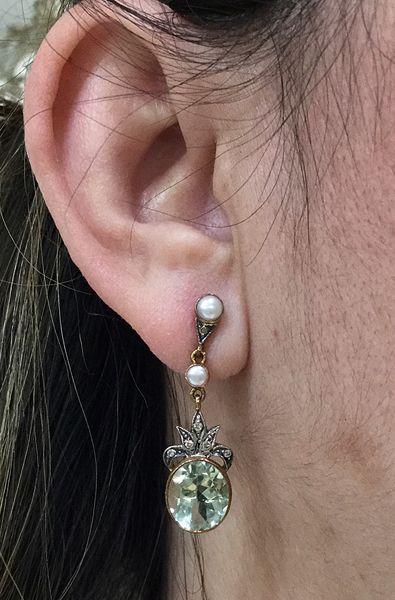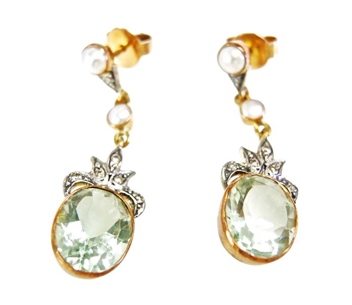 Vintage Style Prasiolite Diamond Pearl Drop Earrings