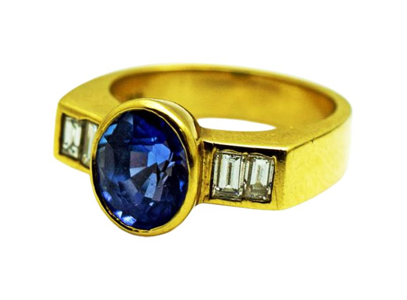 A beauitful vintage 14kt yellow gold ring, circa 1980's, featuring 1 oval faceted cut deep intense violet-purple tanzanite, est. 2.74ct and 4 straight baguette diamonds, est. 0.43ct (VVS clarity & F-G colour). The ring is size 5 and can be sized.